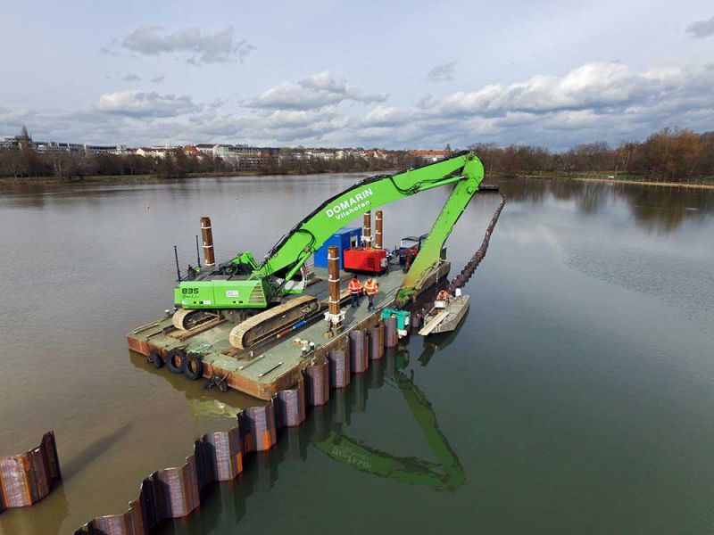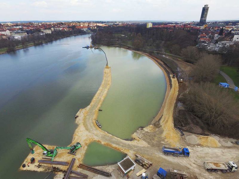 - Naßbaggerung von 13.000 m³ schlammigem Material mit Umschlag auf Sattel-LKW